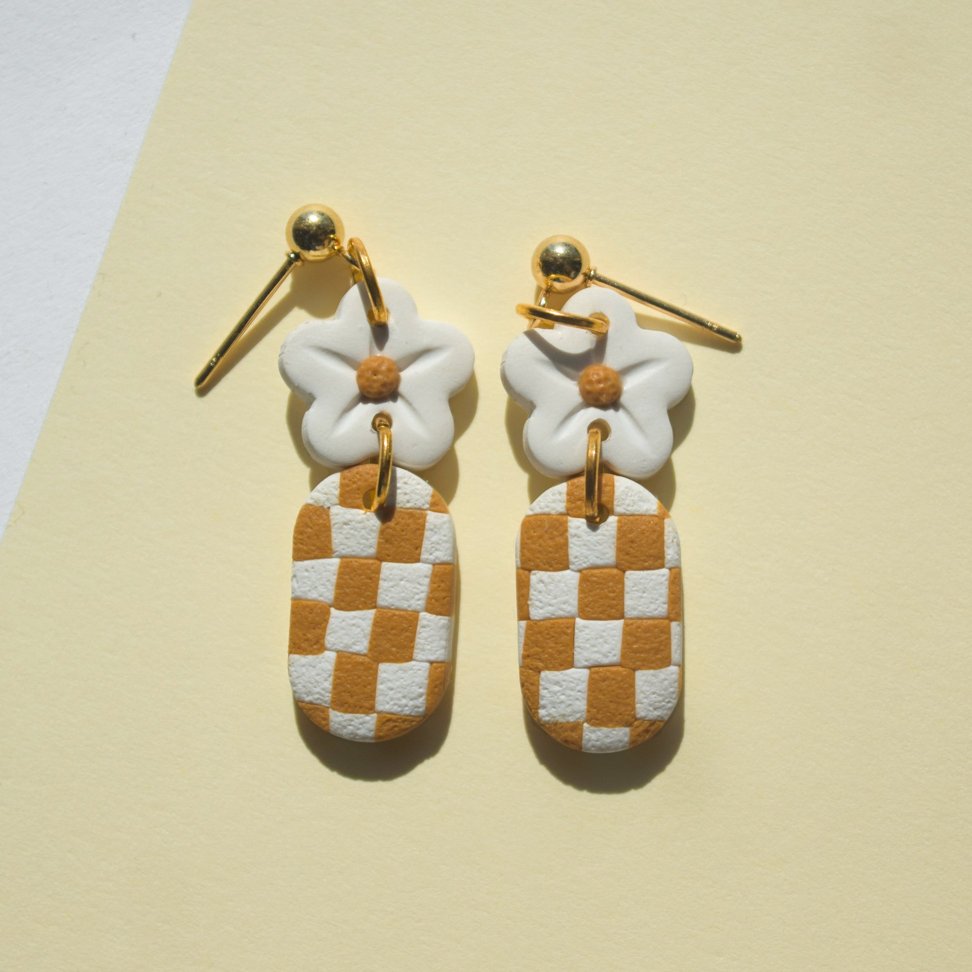 These earrings pair florals with checkers, blending retro and charm. Made from polymer clay, they’re lightweight, comfortable, and add a fun statement to any outfit.