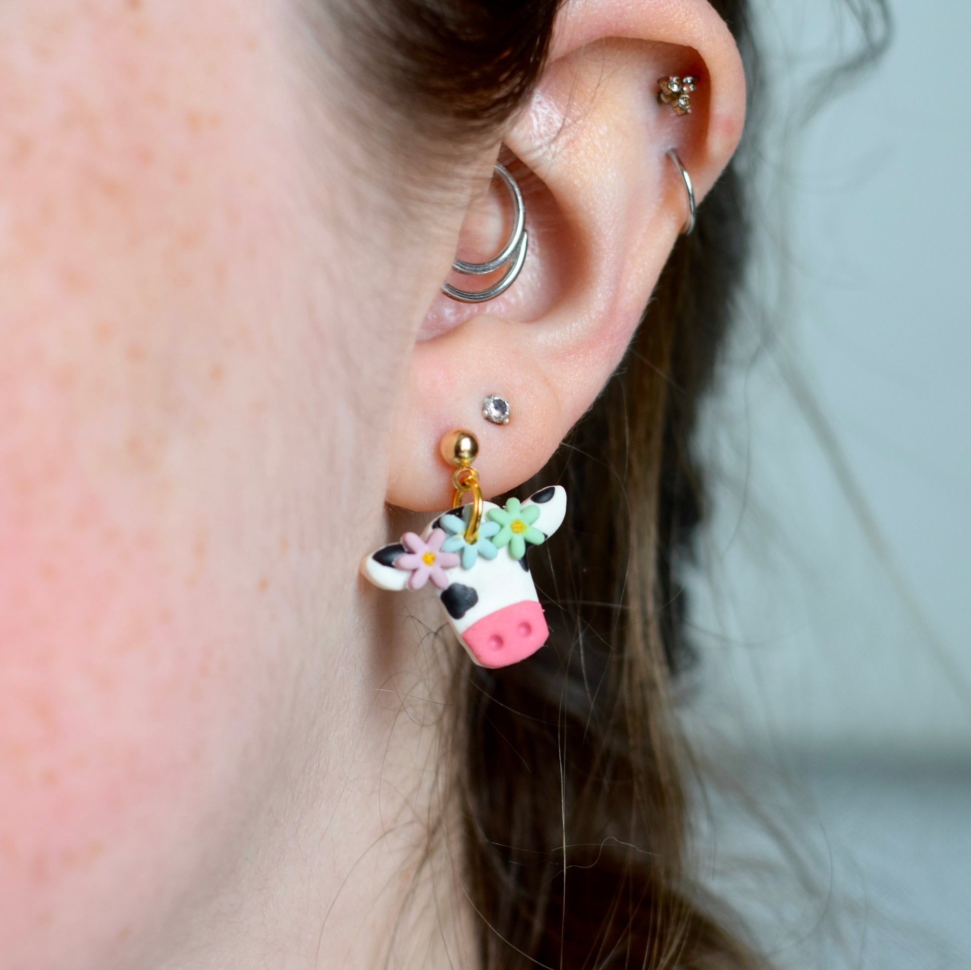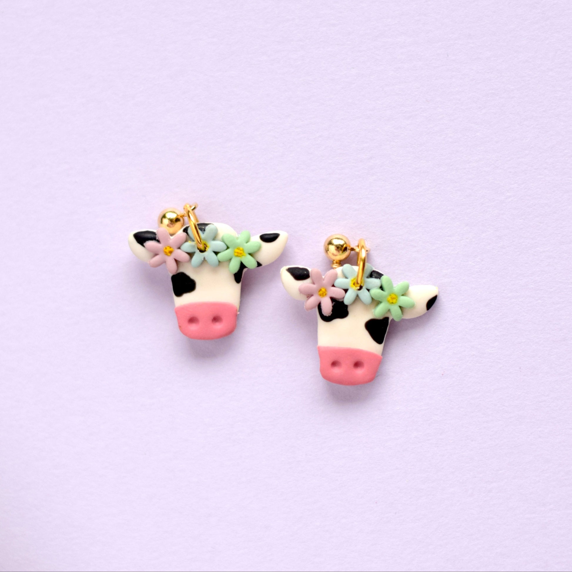 Adorned with a flower crown, classic black spots, and a pink nose, these polymer clay cows are irresistibly cute. Handmade with attention to detail, these earrings are the perfect accessory for adding charm to your everyday look.
