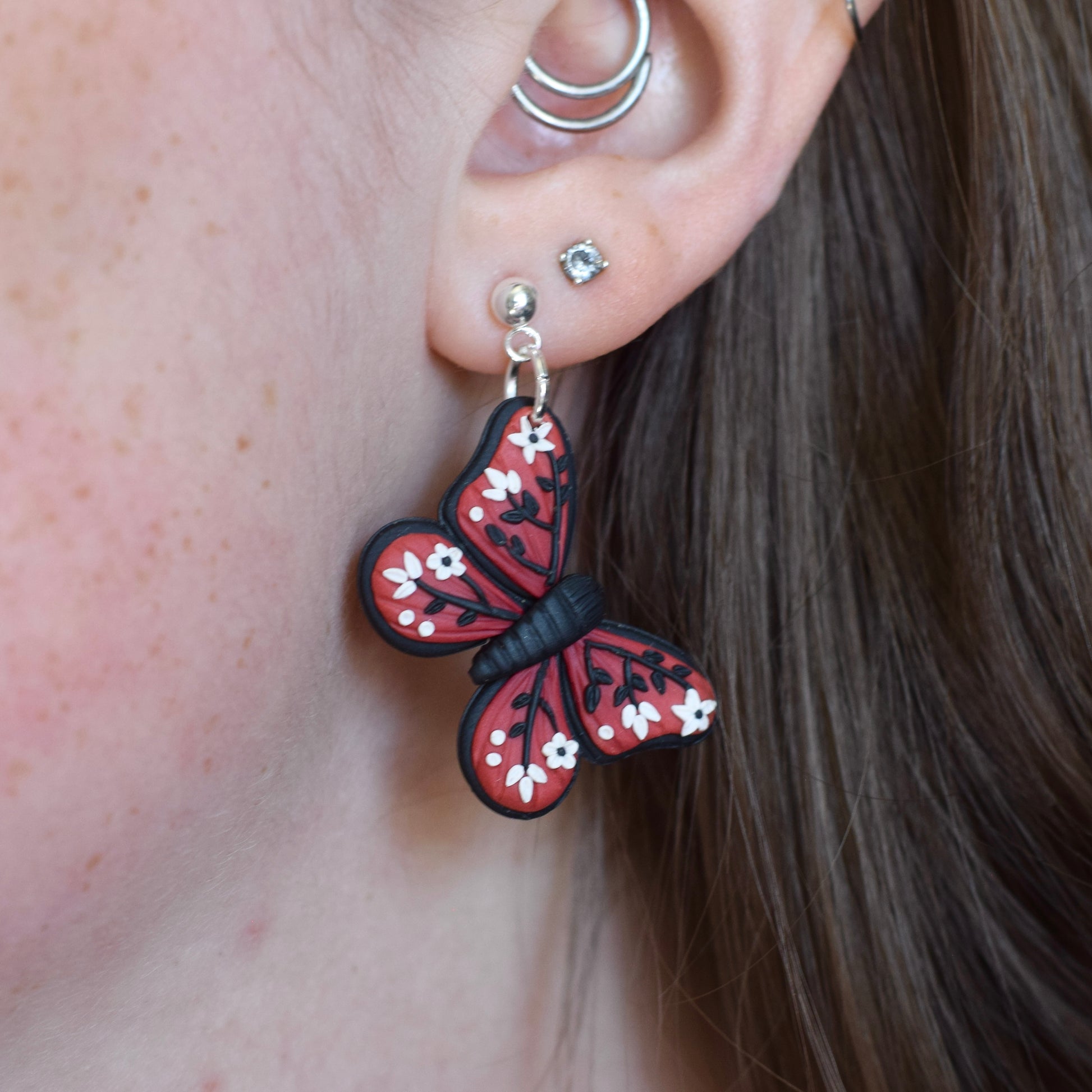 These moth earrings feature a subtle red ombré accented by delicate white florals and bold black vine detailing. Both lightweight and eye-catching, they offer a statement piece that adds to any outfit. Please note that, due to the ombré design, there may be slight color variations in each pair.