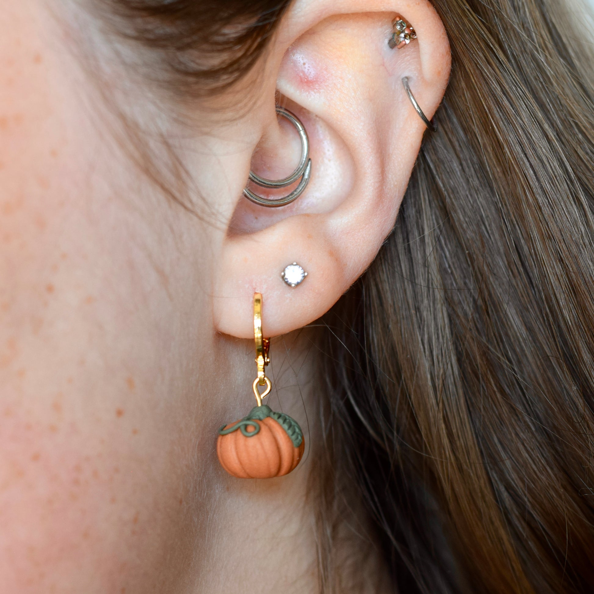 These hand-sculpted pumpkins feature delicate green detailing. Thoughtfully designed on a lightweight huggie clasp, they offer a secure and comfortable fit for all-day wear. They're the perfect seasonal accessory to add warmth and personality to your look.