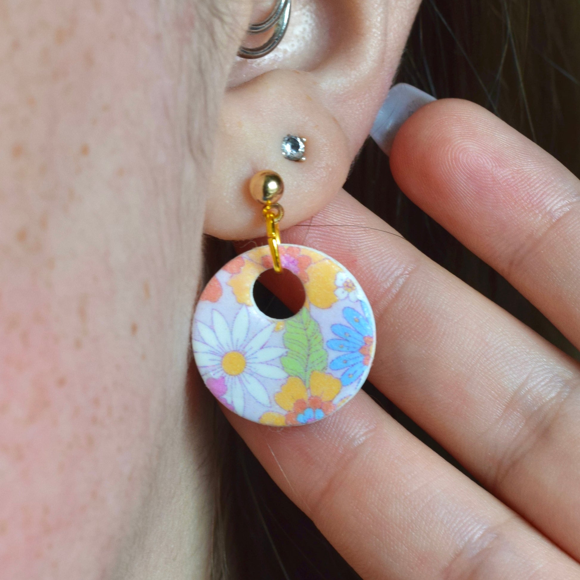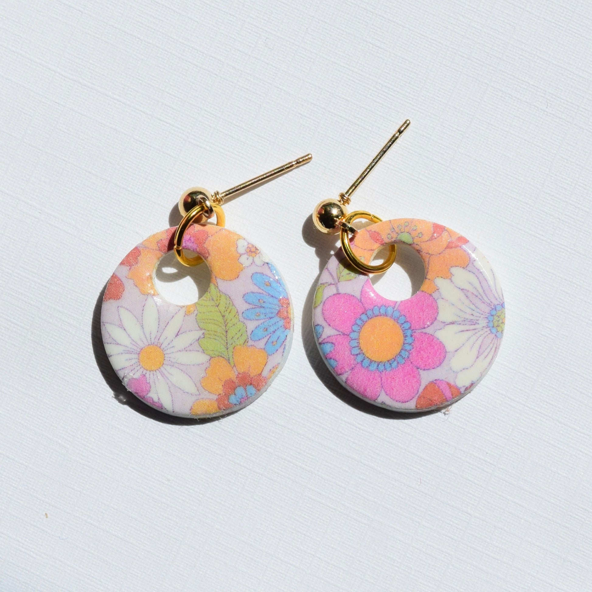 With a vibrant retro floral pattern and a glossy resin finish, these earrings add a playful touch to any outfit. They're crafted from polymer clay for a lightweight feel, and hang from studs for all-day comfort.