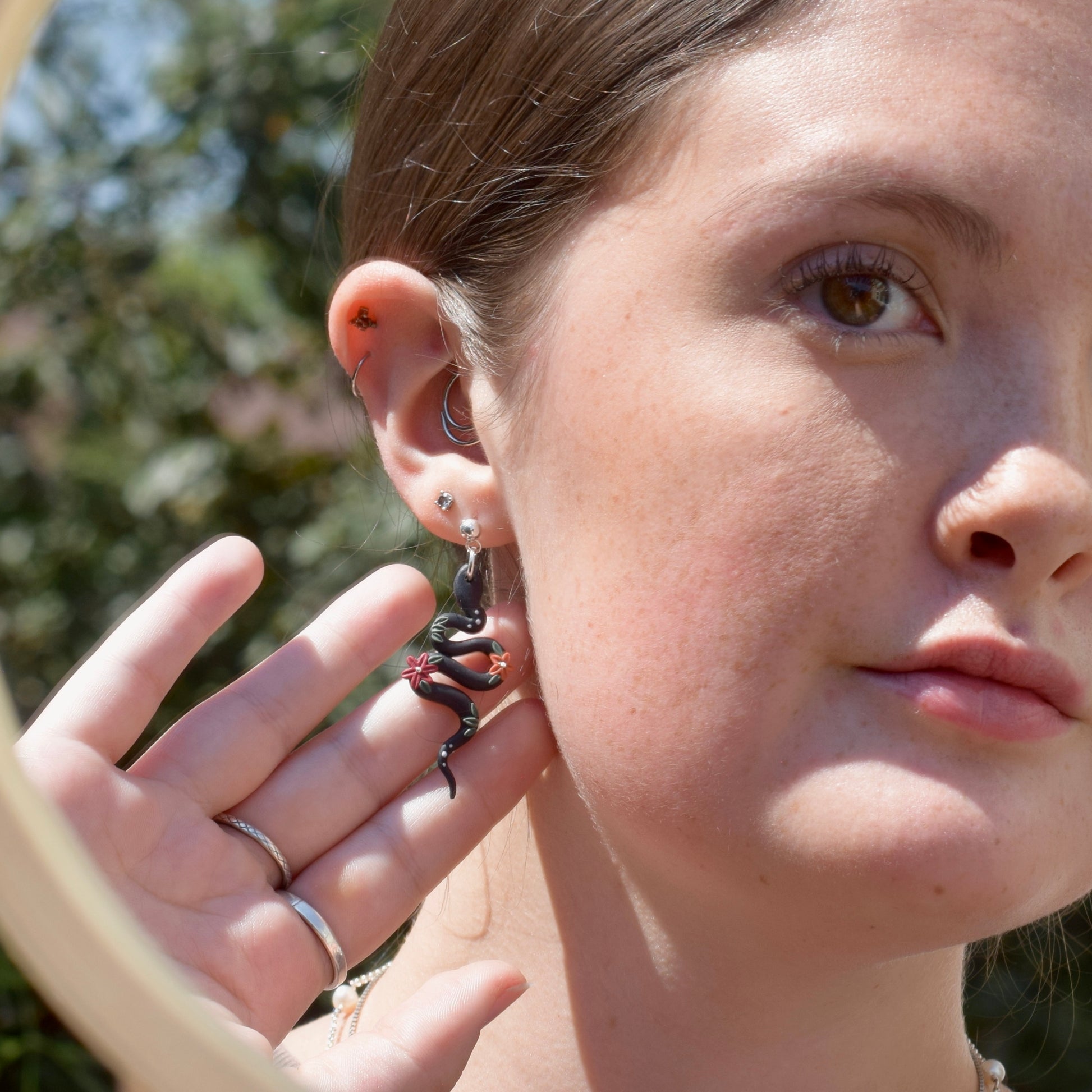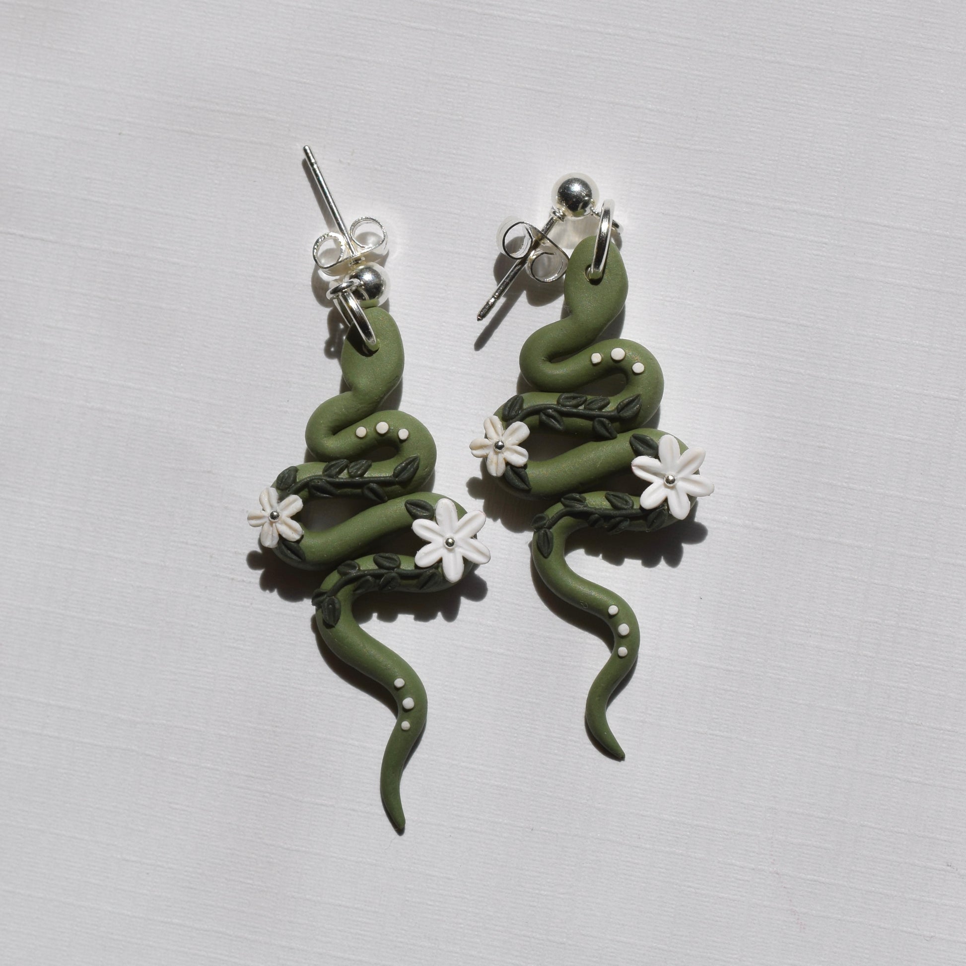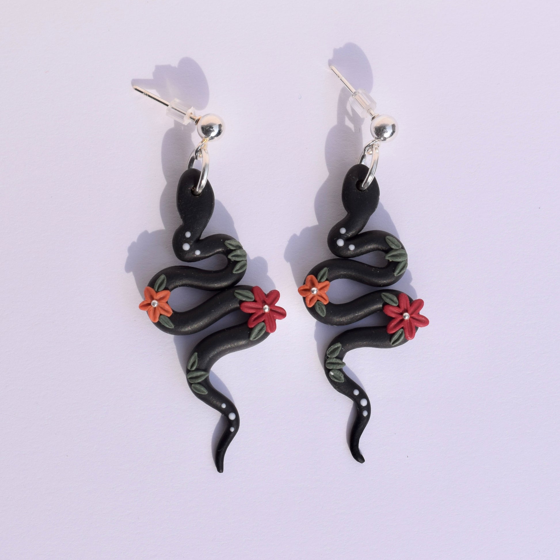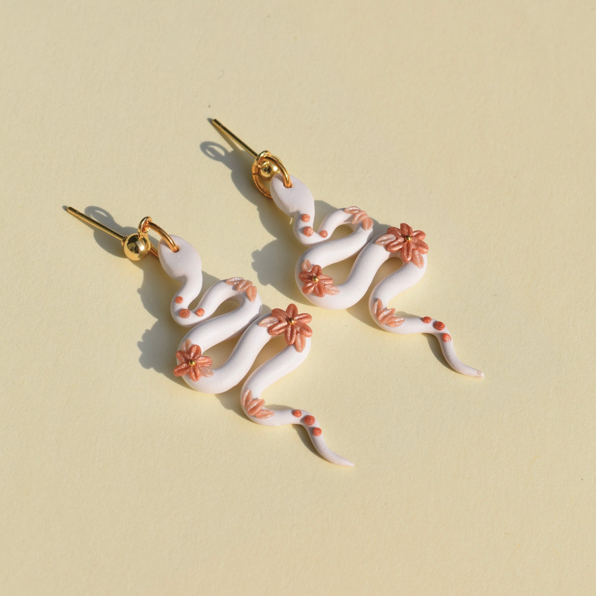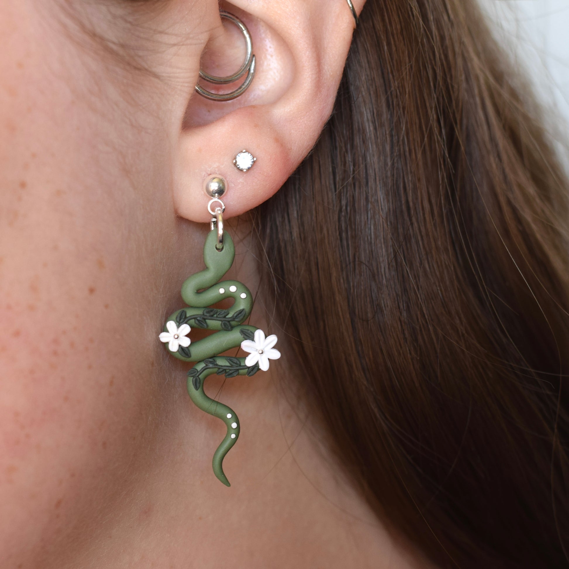 Handmade snake earrings, with floral and leaf details, offered in three colors.