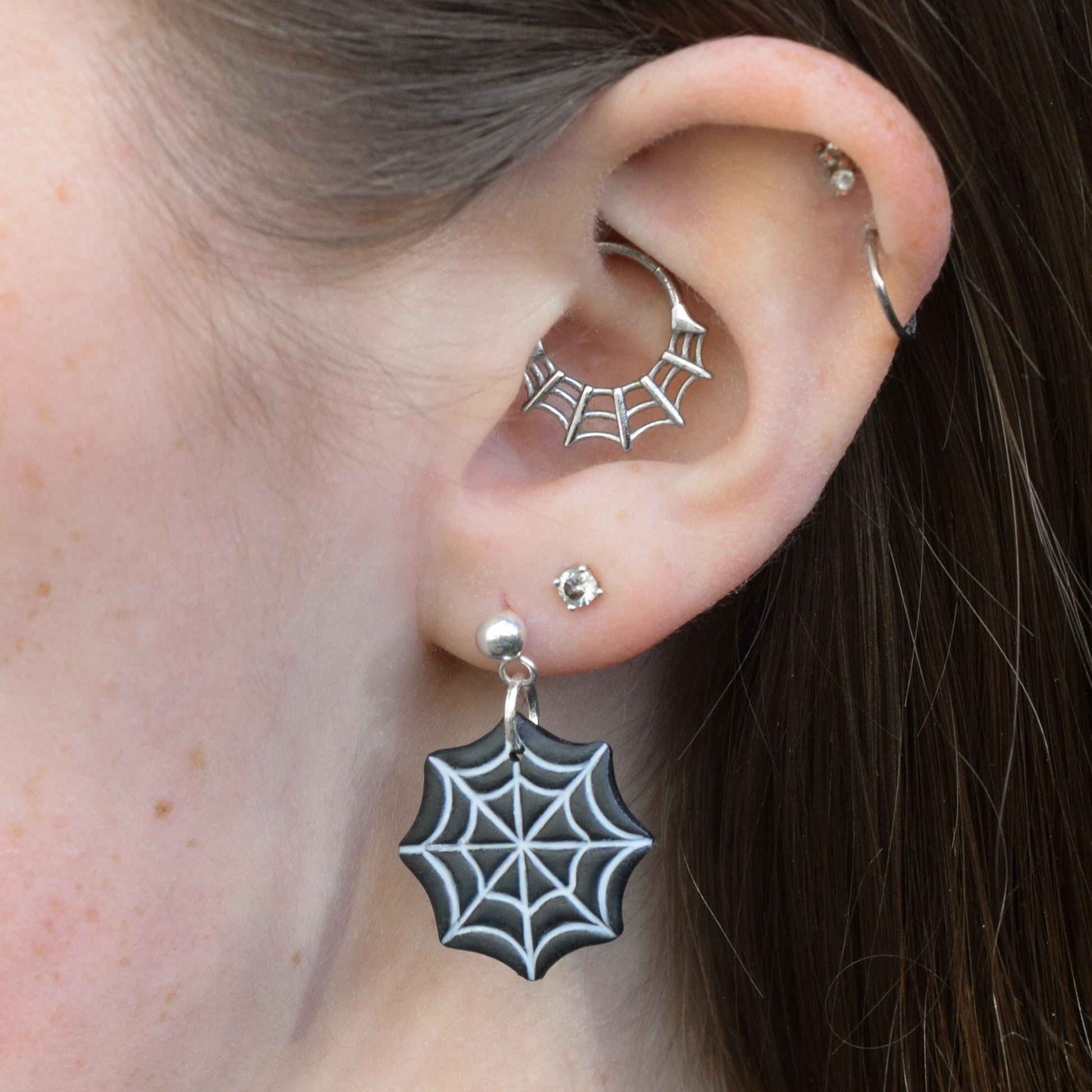 These spiderweb earrings are crafted from black polymer clay and detailed with hand-painted white liquid clay. Comfortable and easy to wear, they’re the perfect accessory for spooky season!