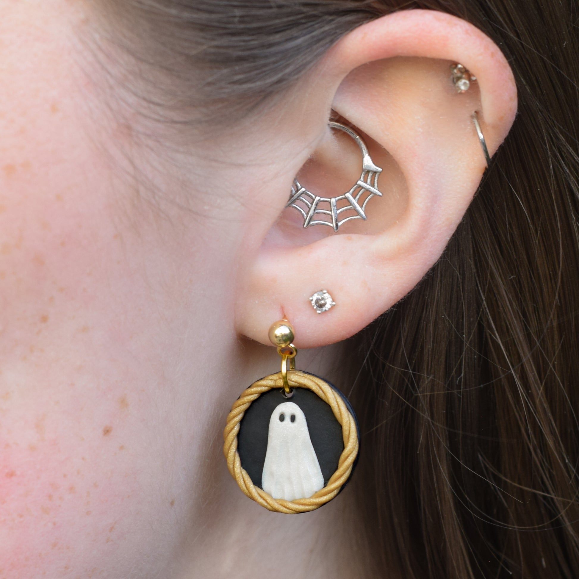 These ghost earrings feature a hand-crafted gold frame that captures a vintage, timeless feel. They’re designed to bring a touch of spooky elegance to your look.